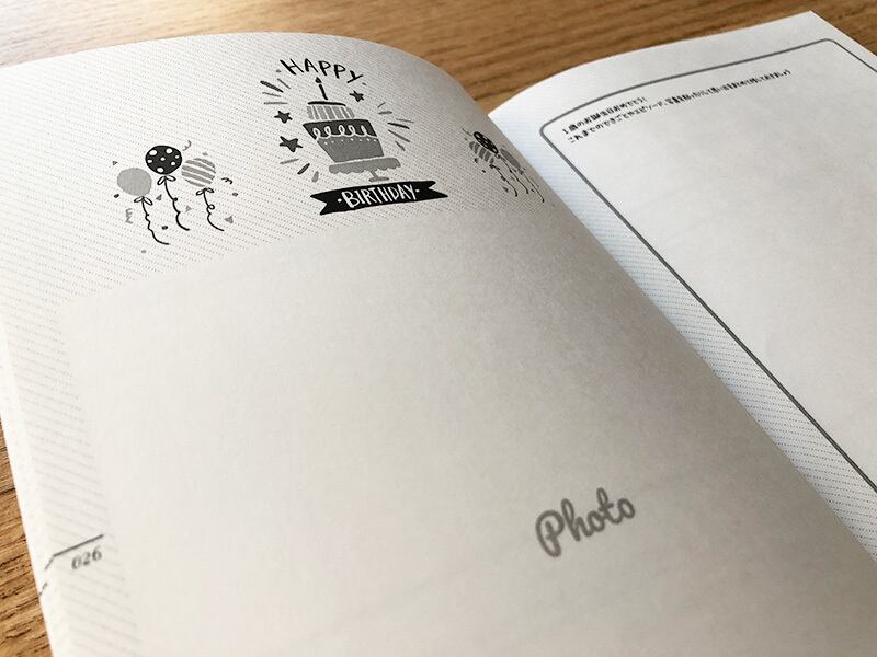 体重やごはんの記録、ハプニングやエピソードなどをまとめ、フリースペースにはその月齢での写真を貼れるようにしました。