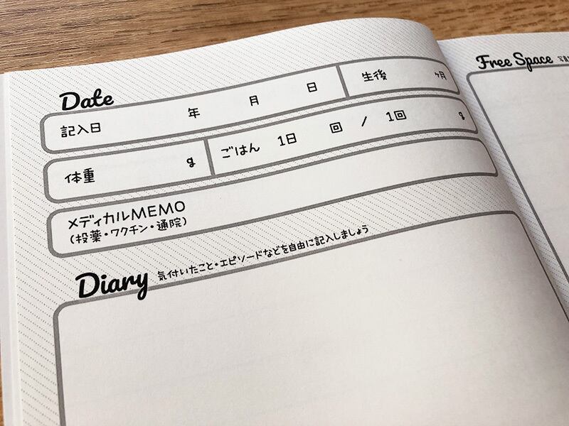 体重やごはんの記録、ハプニングやエピソードなどをまとめ、フリースペースにはその月齢での写真を貼れるようにしました。